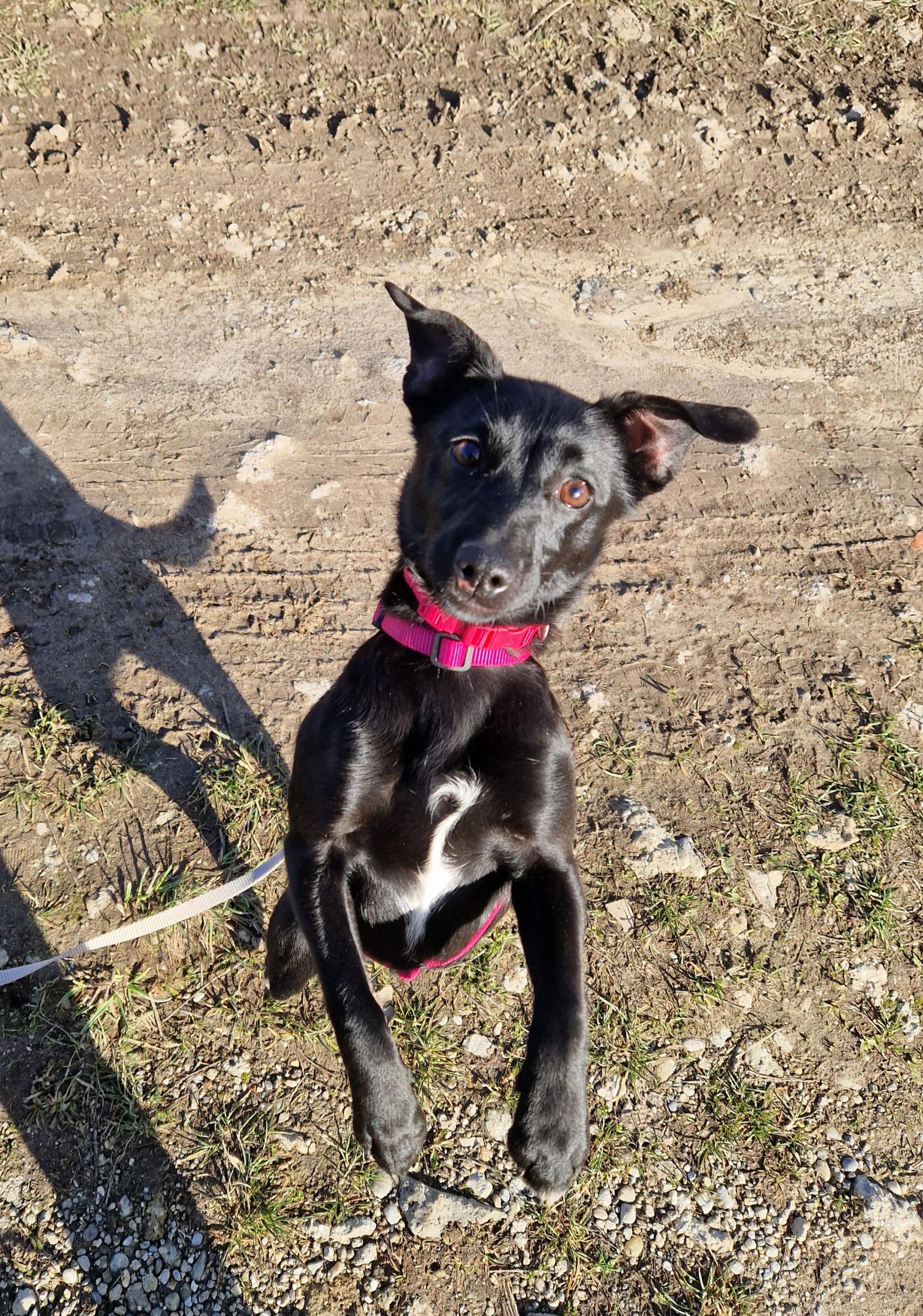 Emberekkel nagyon barátságos, bújós, kedves kutyus. Érdeklődö, kiváncsi és figyelmes.Pórázon is tud már sétálni. Szimonetta most 4-5 hónapos, ahogy növekszik egyre harciasabb, így legjobb lenne egyedüli kutyusnak menne. Fajta társakkal erőszakosan viselkedik ha kajáról van szó.