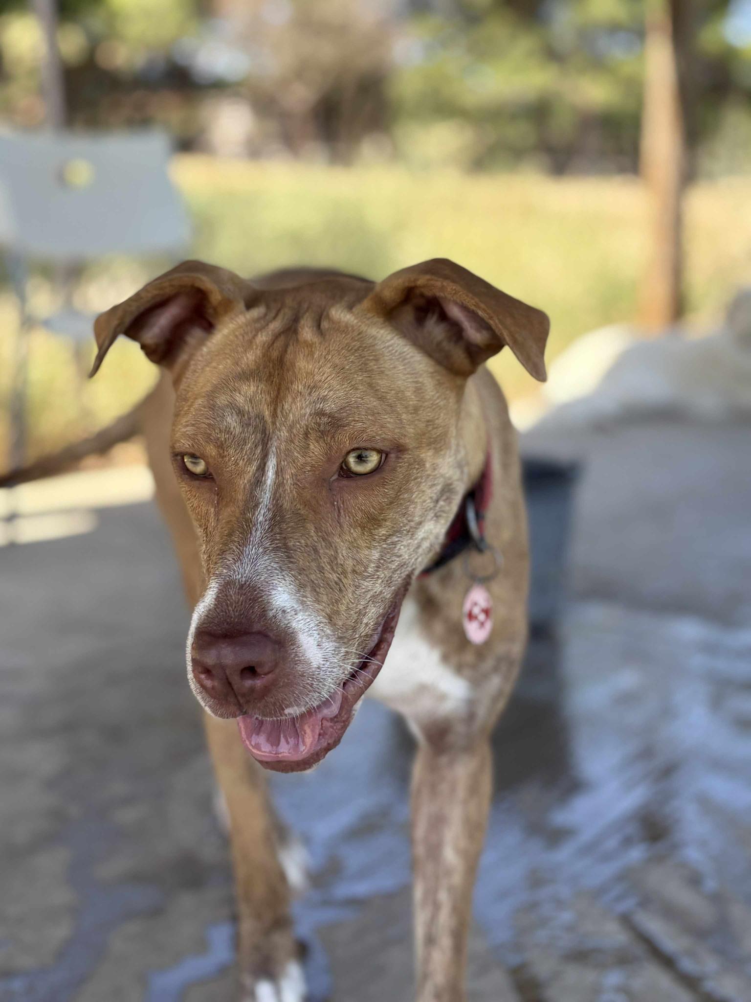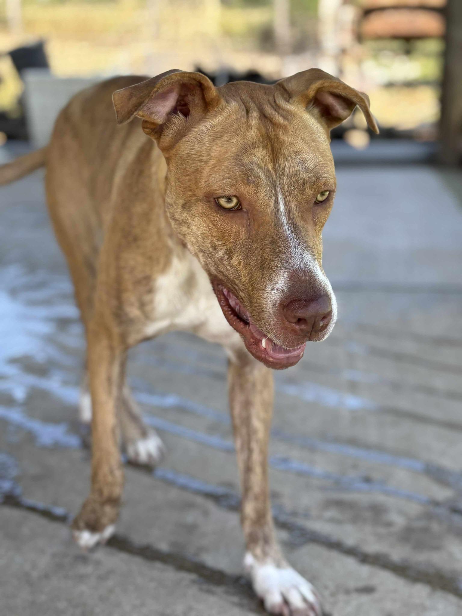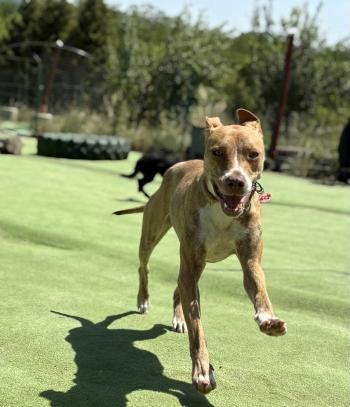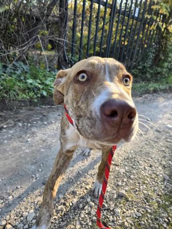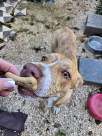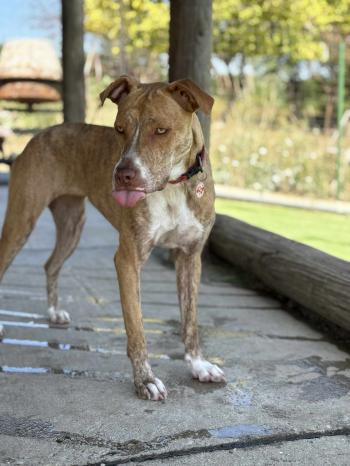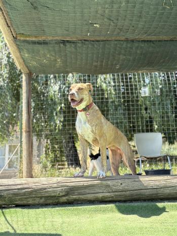 Jelenleg egy kutyapanzióban él, ahol tökéletesen szocializált más kutyákkal – de a szíve egyetlen dologra vár: egy saját emberre.