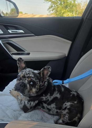 Az egyik fülére nem hall jól, ezért csak pórázon sétáltatható – de úrilányhoz méltón szépen közlekedik rajta.