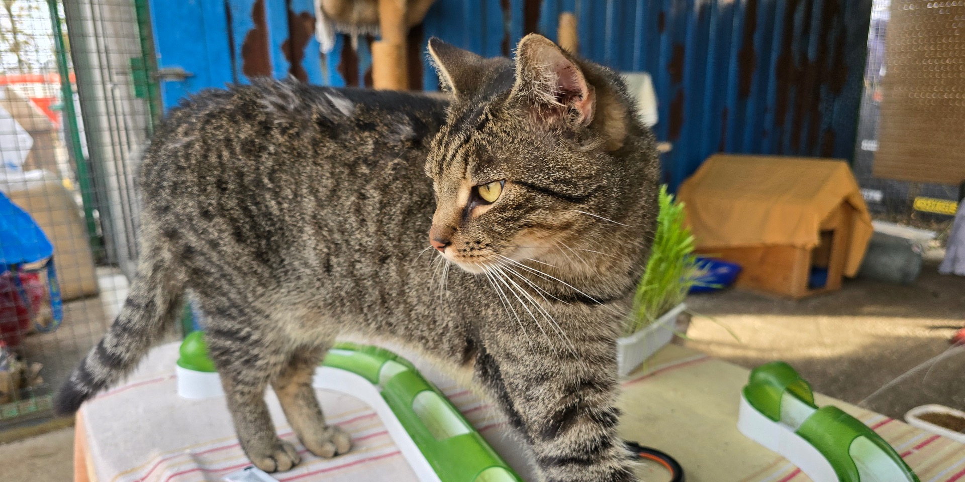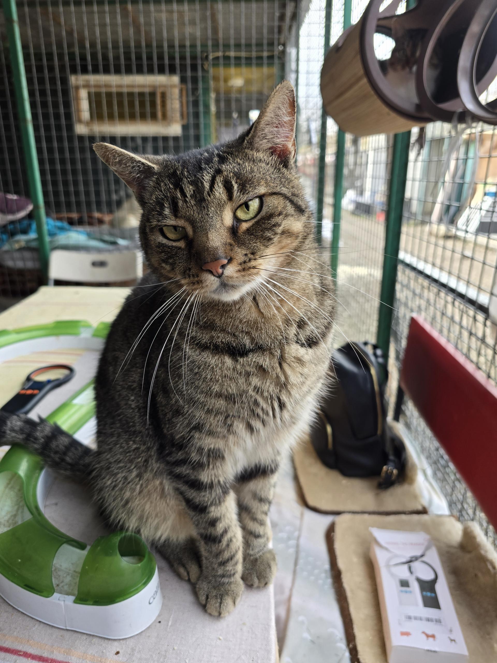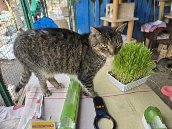 Miklós, Felv/FIV negatív, cirmos kandúr. A fején lévő sérülés már szépen gyógyul (balesetet szenvedett, így találták), nem veszi a kedvét, így is simogatható és érdeklődő.