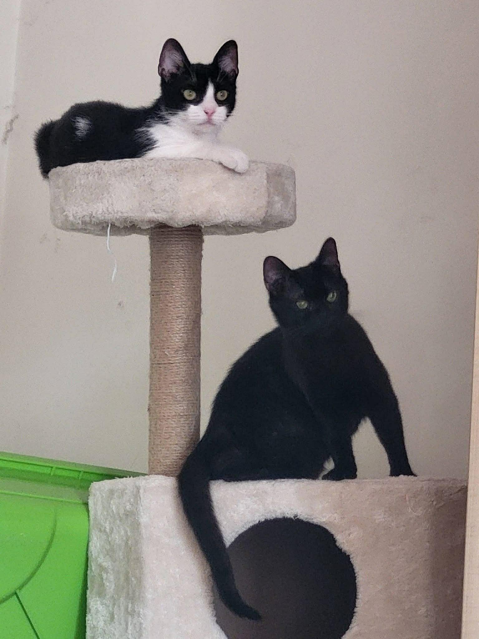 Neo (fekete): A legkisebb termetű. Hatalmas száraztáp-rajongó, ami sokat segített a bátrabbá válásában. Óvatosan már ő is közeledik az emberhez, rettegése sokat oldódott.