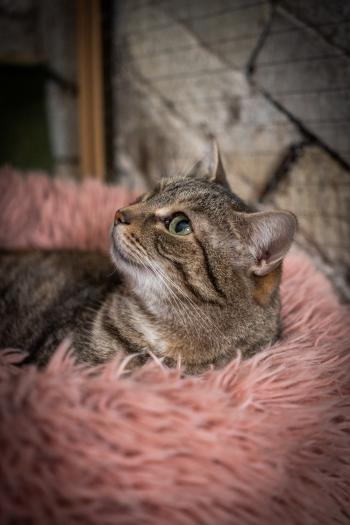 Nyugodt természetű, szeretetéhes, kedves dorombolós cicalány, ha sikerült a bizalmába férkőzni. A menhely legrégebbi lakójaként várja, hogy valaki végre őt válassza. Nem domináns cica, inkább a háttérben marad több cica között.